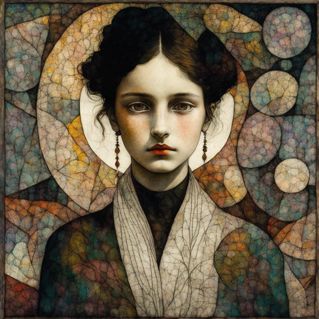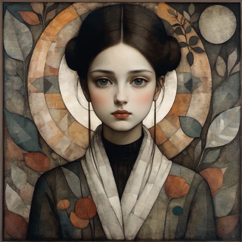 A painting of a young girl with braided hair, a subdued expression, and a geometric abstract background with a moon.
