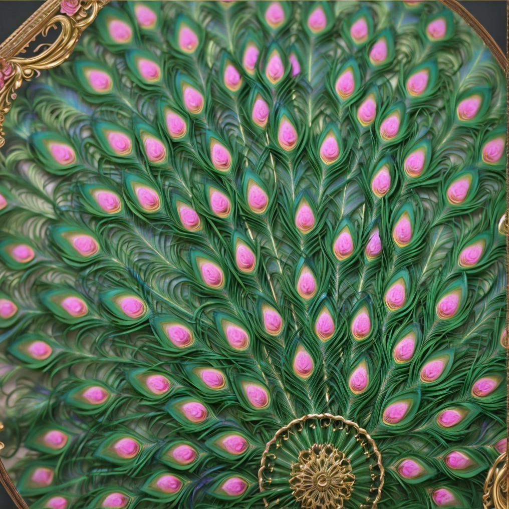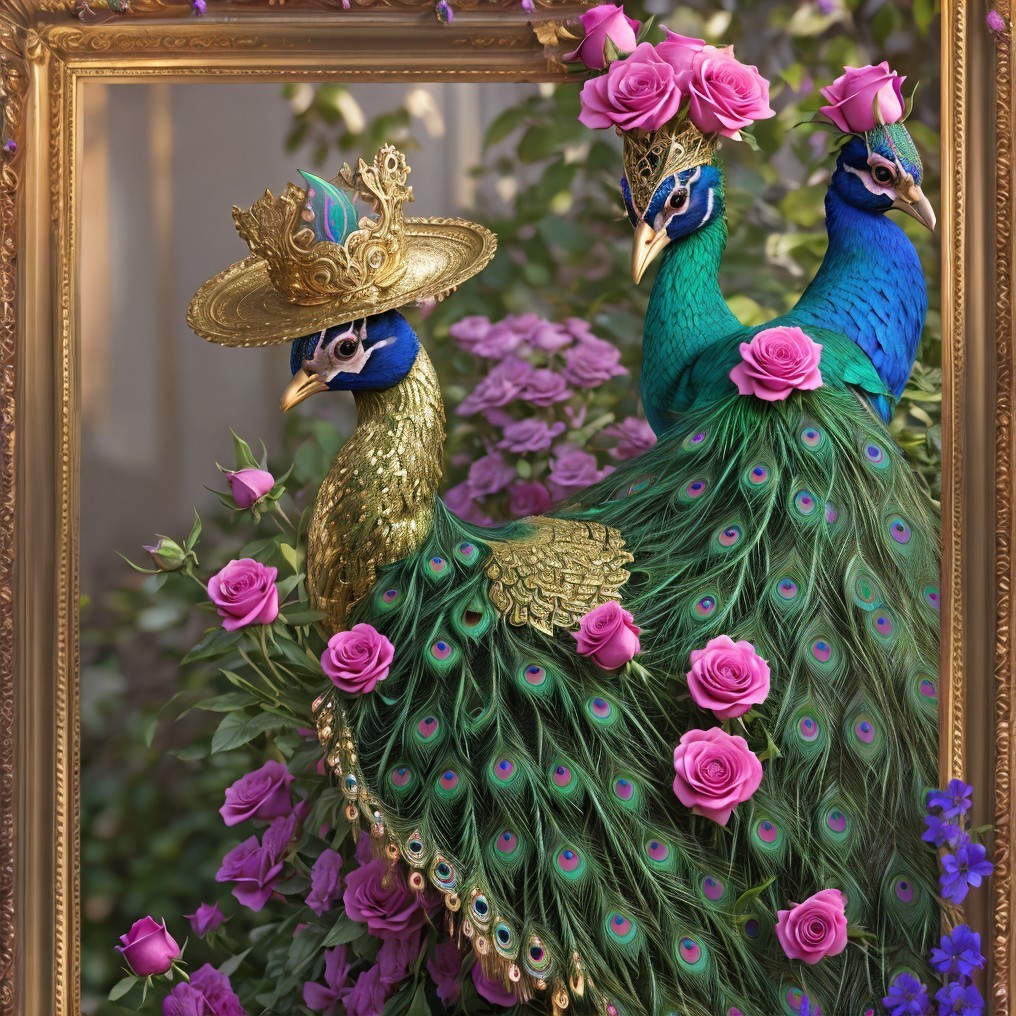 Prompt: Deep gold ornate frame, shrink to fit inside the frame, inside frame is a gorgeous hat made from brightly colored peacock feathers, pink roses on long stems sticking from between the feathers, colors are jewel-tone, penetrating, background has light lavender vertical stripes, nothing hangs over the frame