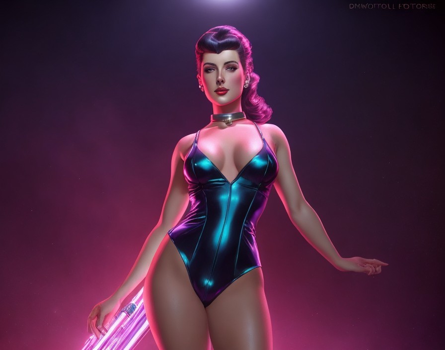 Female character with purple hair in futuristic bodysuit and sci-fi weapon on pink backdrop