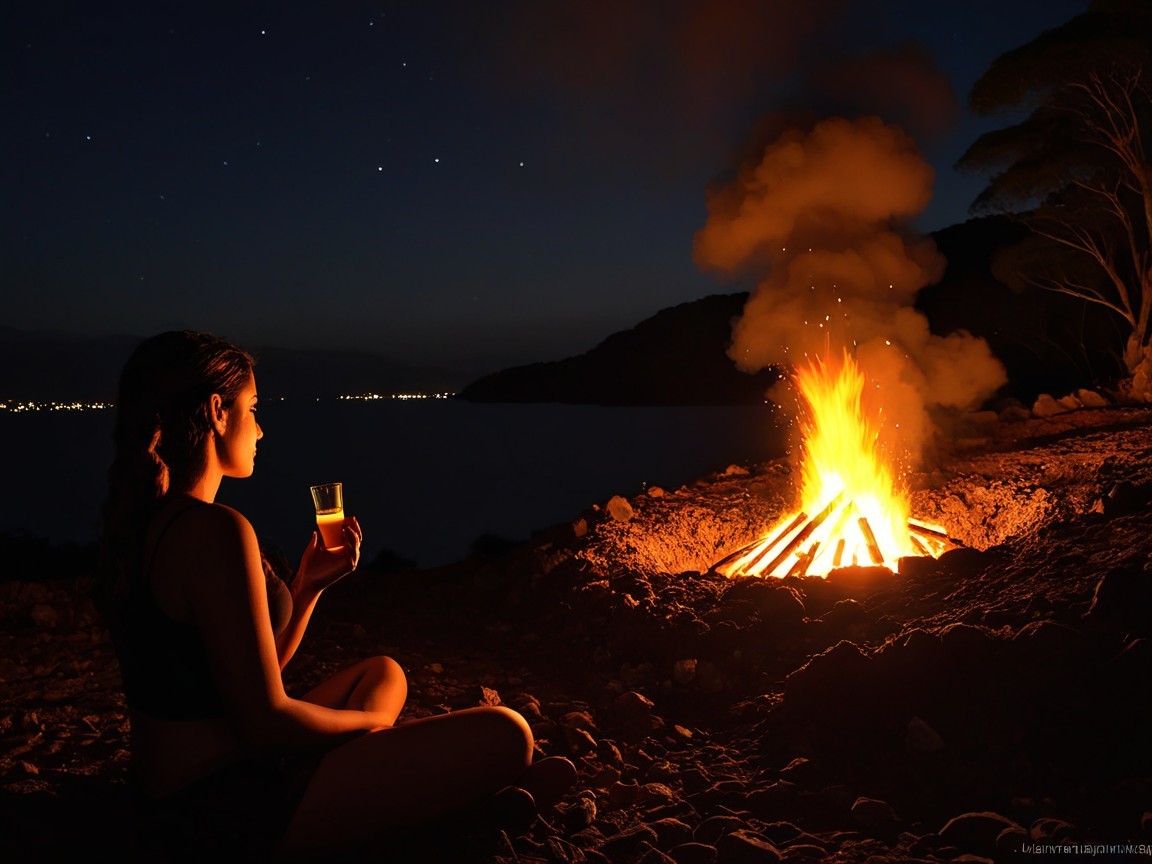A woman sits by a glowing campfire at night, holding a drink and gazing at the flames. The dark sky sparkles with stars, reflecting a serene and cozy atmosphere by the water's edge.