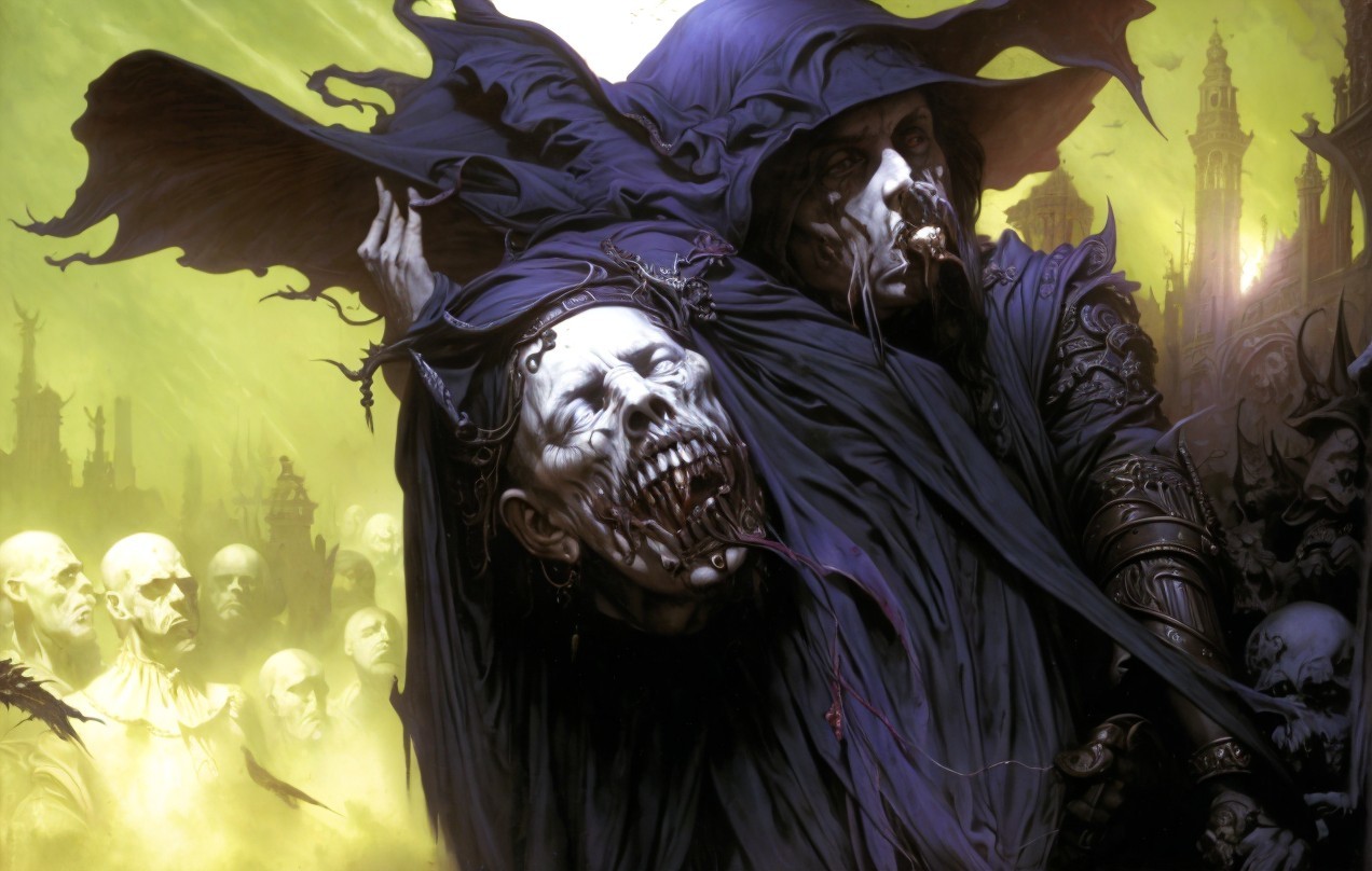 Dark Fantasy Artwork: Grim Reaper Figure with Decapitated Head and Skulls