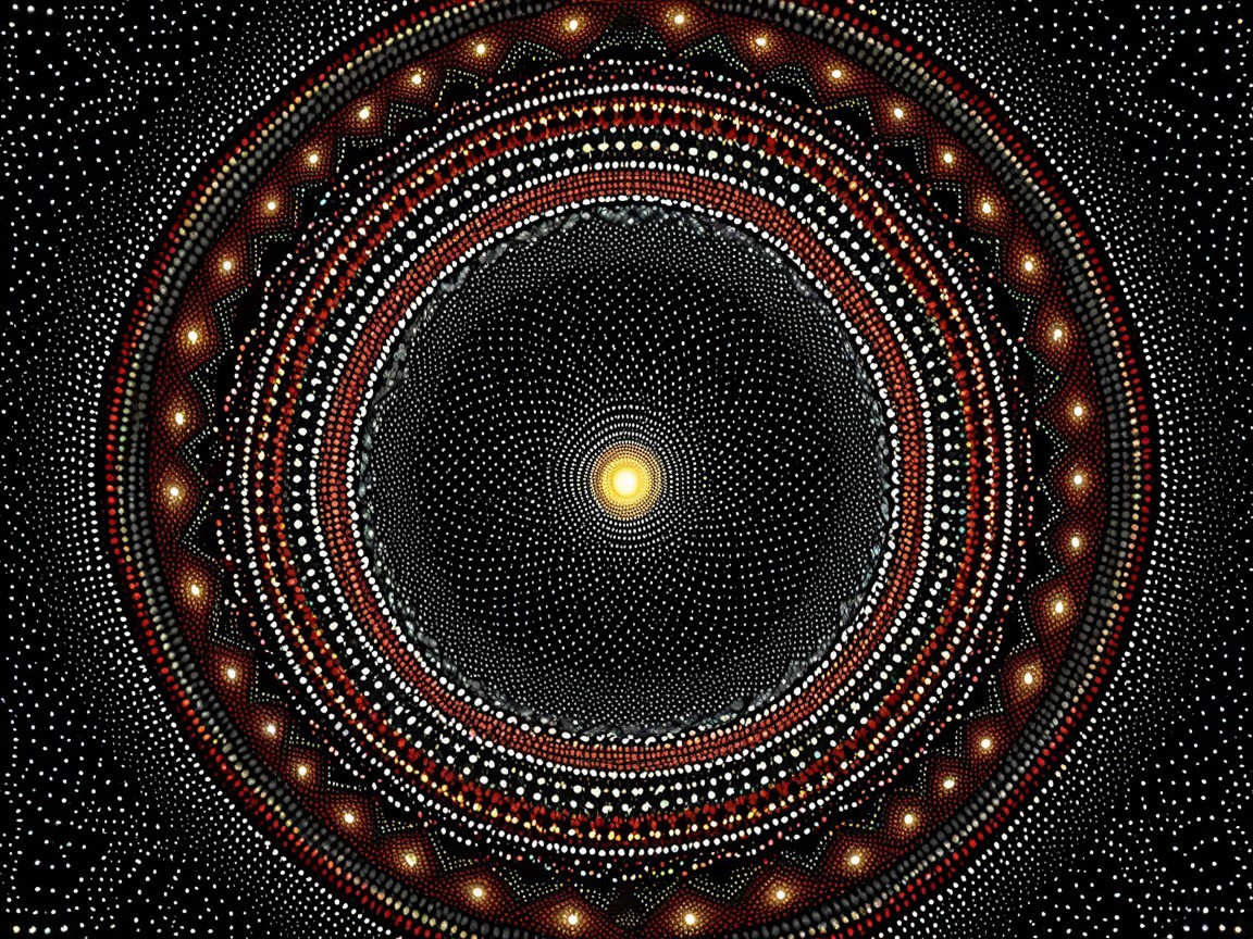 The image features a mesmerizing circular pattern with concentric rings of glowing yellow and orange dots against a deep black background, creating a sense of depth and movement.