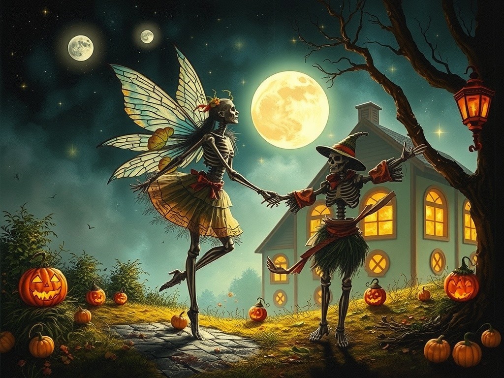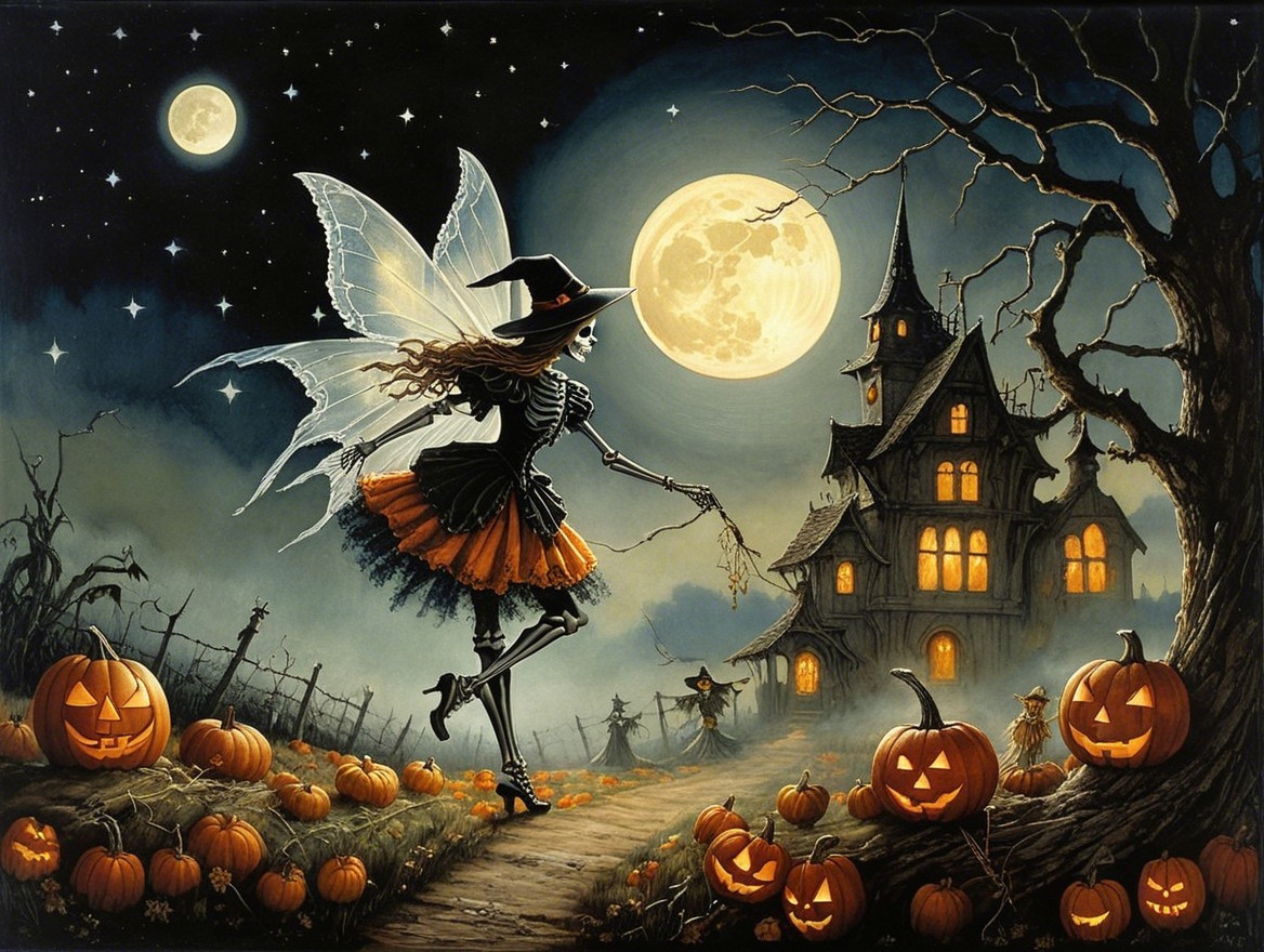 A whimsical Halloween scene features a skeleton with wings dancing under a full moon, surrounded by pumpkins and bats, with a spooky house in the background and a dark, starry sky.