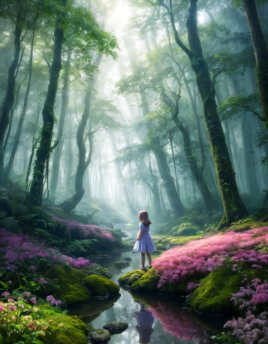 A young girl stands in a misty, enchanted forest with vibrant pink flora, sunbeams piercing through the canopy overhead.