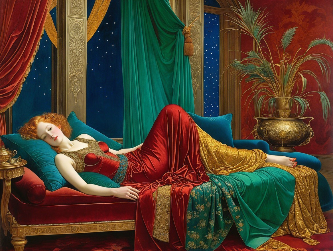 A serene woman in a flowing red gown reclines elegantly on a richly adorned couch, framed by vibrant curtains and a starry night outside, evoking a sense of tranquility and beauty.
