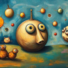 A whimsical, colorful scene featuring oversized, cartoonish planets with faces, floating in a vibrant sky alongside cute creatures like birds and a cat, creating a playful, imaginative atmosphere.