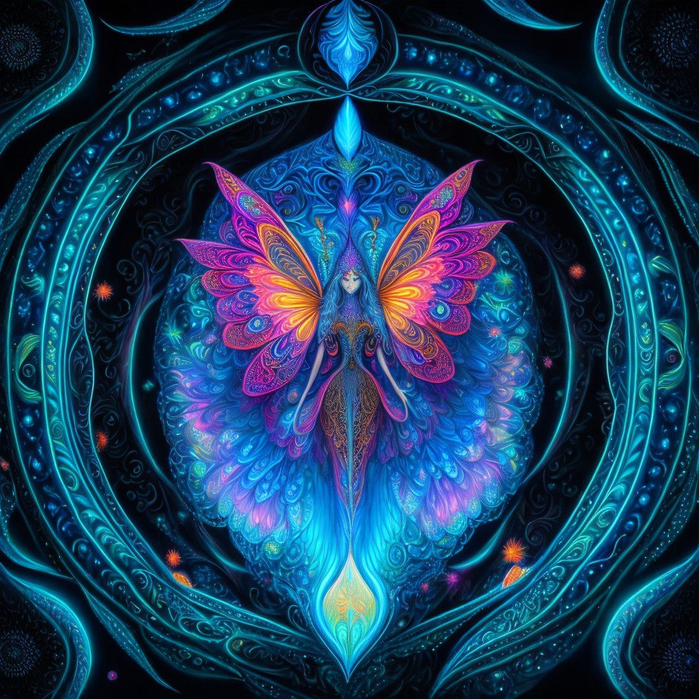 + Prompt:intricately designed painting in the style of artist "Alex Grey", but darker, depicting a well detailed very scary fractal fairy, intricately designed wings and body with vivid colours and extremely detailed psychedelic fractals; fractals, colour palette is mostly fluoresecent and bright colours with a dark background; the fairy is flying towards the lens, "coming to get you". The background is a "twisted, dark, forest with trees that are branching out in fractals". Add the "self transforming machine elves" effect only in the background. Award winning painting, attention to detail, no smudges, no blurry face, high quality realistic facial features, HD, 4k