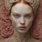 A ethereal figure with intricate, lace-like attire features delicate floral accents. Her striking gaze and elaborate headdress evoke a sense of otherworldly beauty and elegance.