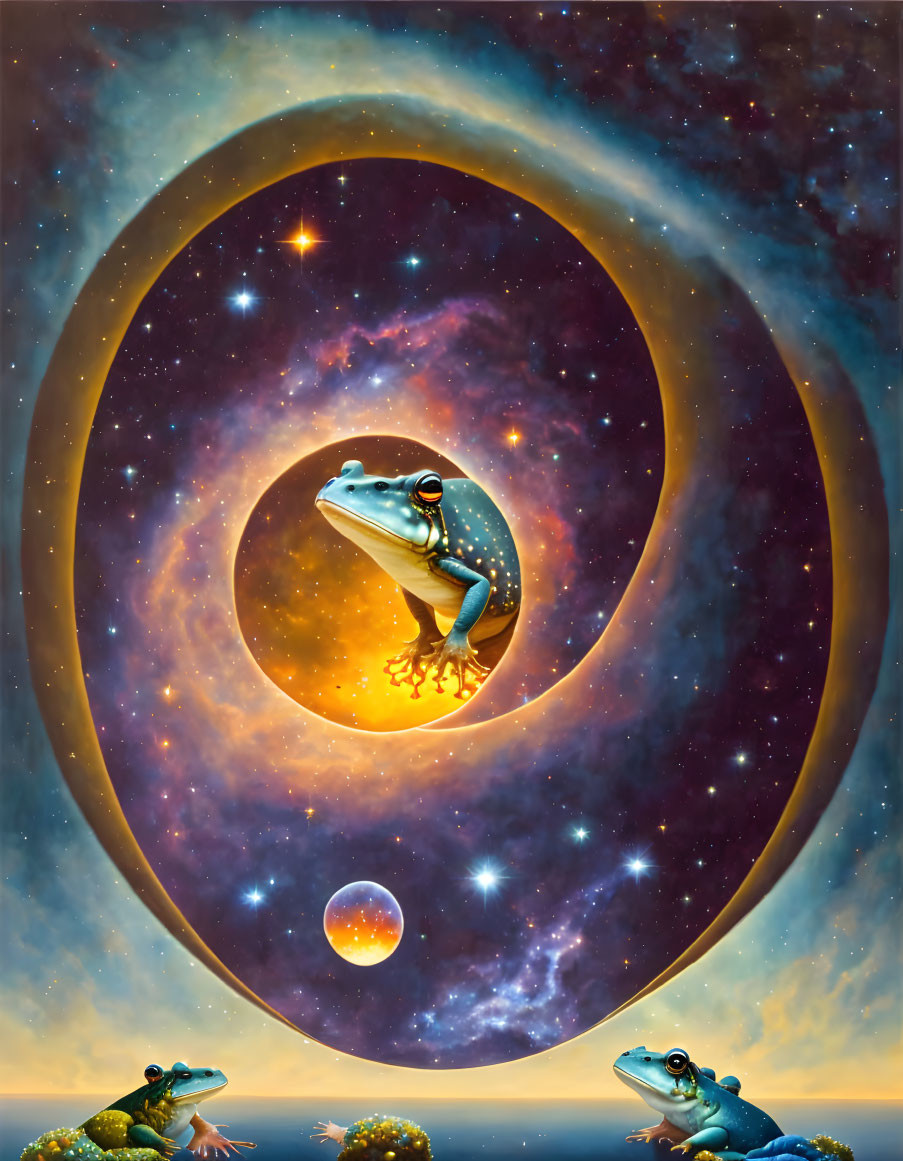 Prompt: surrealistic gas exchange of giant cosmic sarcastic frog in the center of universe, on perimeter Pillars of Creation, nebulas and supernovas, by Ernst Fuchs