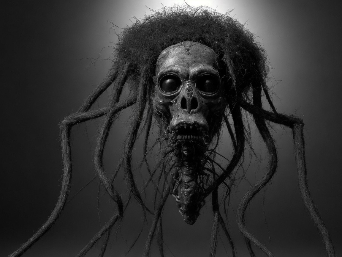 The image depicts a surreal creature with a human skull for a head, long black hair, and multiple spindly legs, creating a haunting and eerie appearance against a dark background.