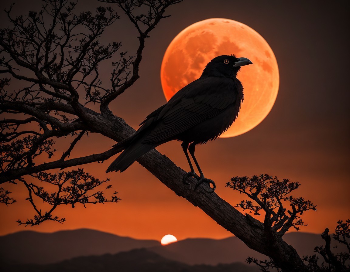 landscape in a very intense orange color with a red moon, T-branched tree cradling the silhouette of an enigmatic great black bird bird, full orange moon casting, single colossal great moon, epic light onto the textured grains of the wood, sharp focus, cinematic, dynamic lighting, perfect landscape, ultra fine, beautiful, highly detailed, 16k, RAW, HDR, masterpiece, award winning, Mysterious