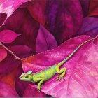 A vibrant chameleon perches on a green branch that is set against a striking pink background.