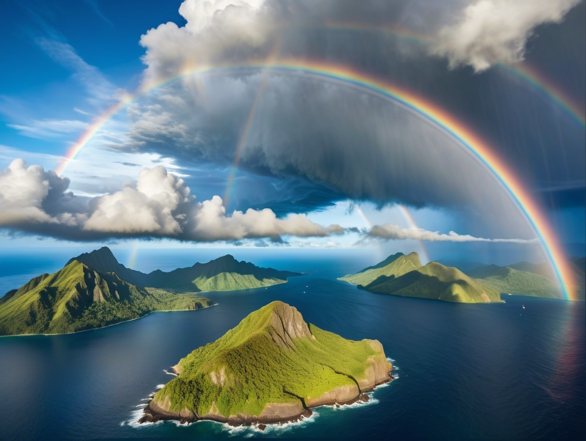 A breathtaking aerial view of lush green islands surrounded by deep blue waters. A vibrant rainbow arcs over the scene, framed by dramatic clouds, creating a serene and picturesque landscape.