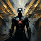 A powerful superhero in a sleek, black costume with intricate designs, standing confidently against a dramatic backdrop. The costume features a glowing red emblem at the center of the chest. The background is a fusion of dark hues and shimmering gold accents, with shards of glass or energy radiating outward, creating a dynamic and intense atmosphere. The hero's pose is strong and assertive, exuding an aura of strength and determination. The overall mood is both mysterious and heroic, capturing the essence of a modern comic book aesthetic.