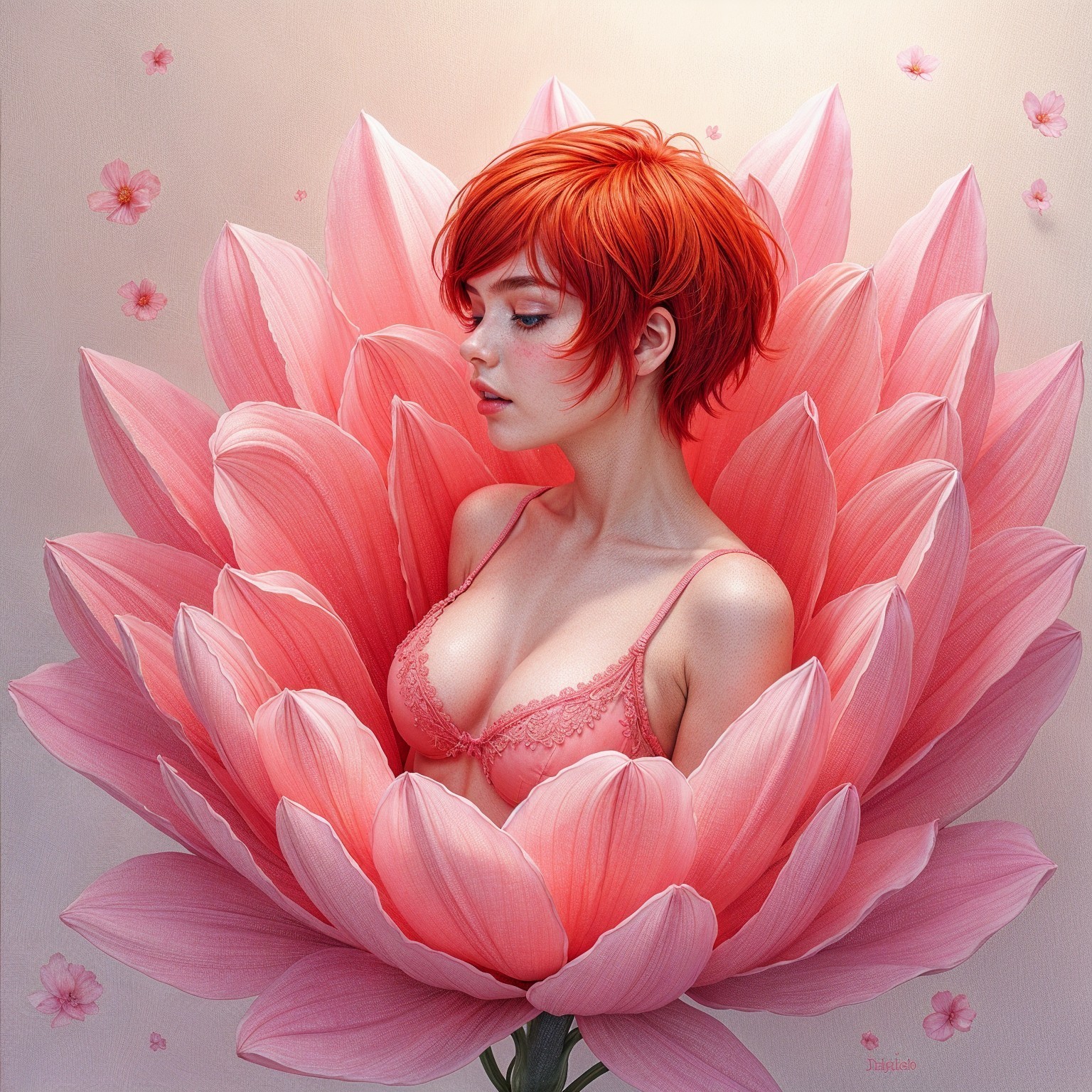 A young woman with vibrant red hair emerges from a large pink lotus flower, exuding a sense of ethereal beauty, surrounded by soft petals and delicate roses in a dreamy atmosphere.