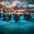 A stunning landscape features multiple cascading waterfalls flowing into a turquoise river. A vibrant sunset illuminates the scene, with a starry sky and moon visible above lush green cliffs.