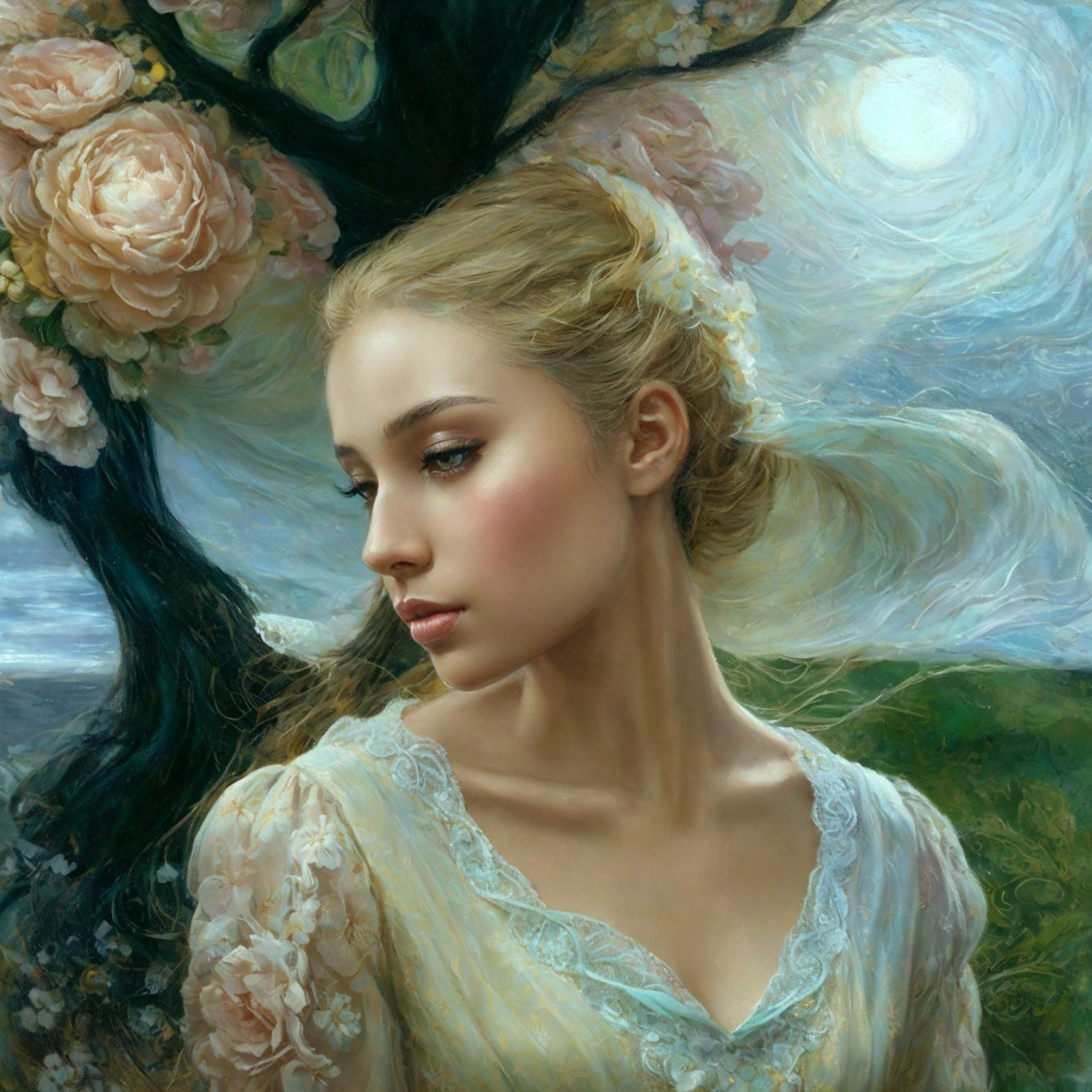 A serene portrait of a young woman with flowing hair, adorned with flowers. Soft, ethereal colors create an enchanting atmosphere, highlighting her delicate features and tranquil expression. Original Promp  by Vincent Godard