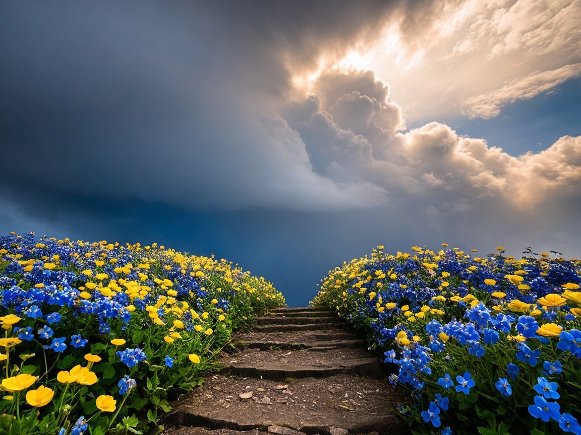 Serene Landscape with Stairs, Flowers, and Rainbow