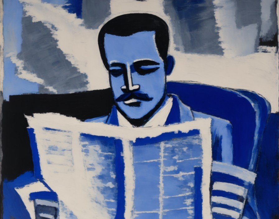 A stylized illustration of a man with a mustache reading a newspaper featuring a world map, donning a blue-striped suit.