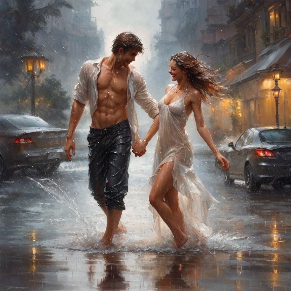 Prompt: Two happy lovers dance in the rain their barefoot clothes wet. Splashing water, water drops, Andrew Atroshenko Artgerm Greg Rutkowski Art, very detailed, beautiful quality.