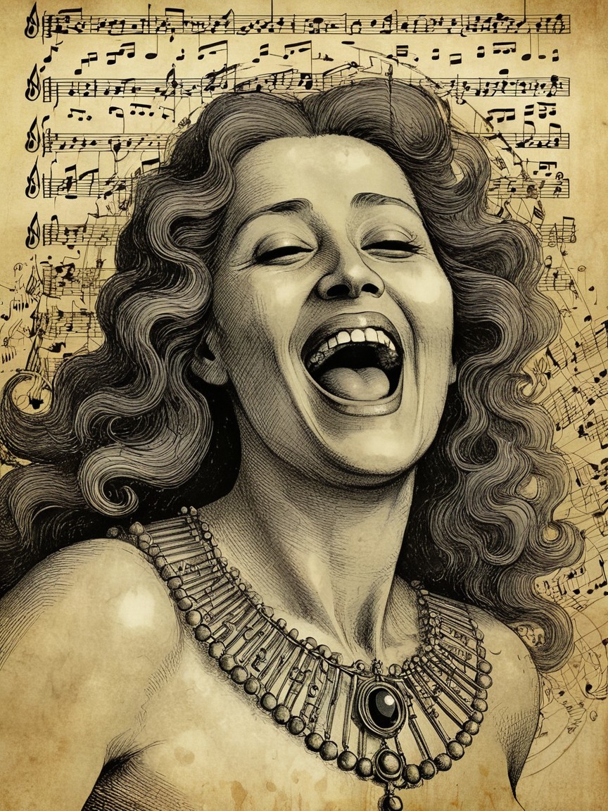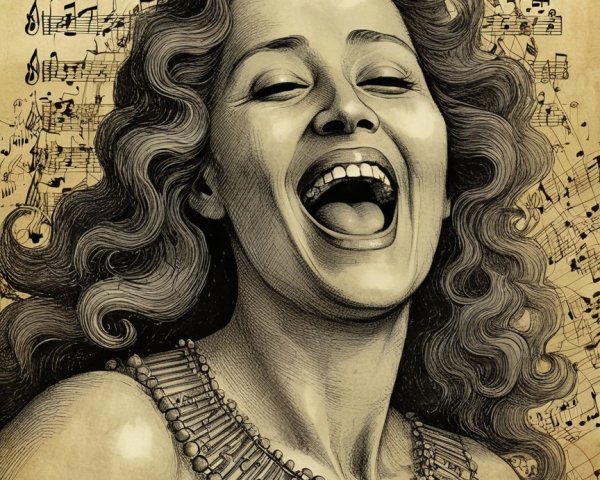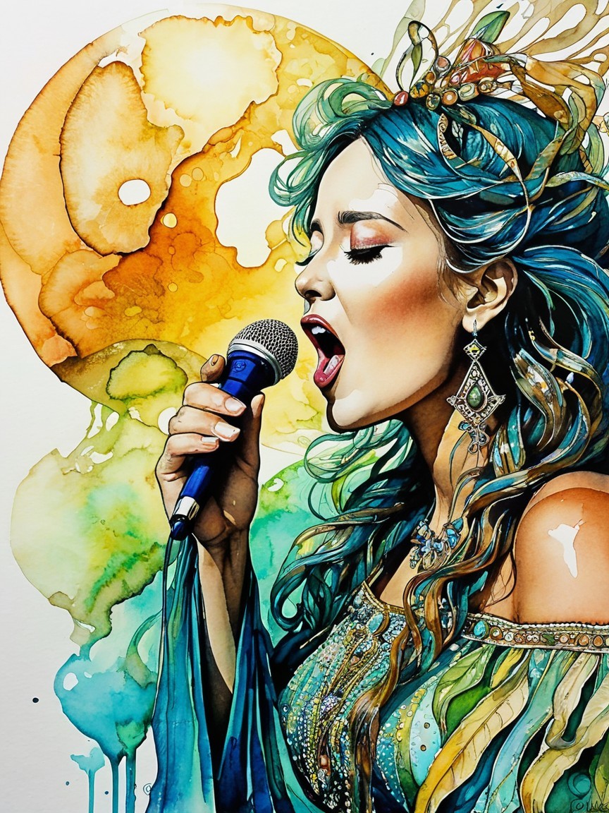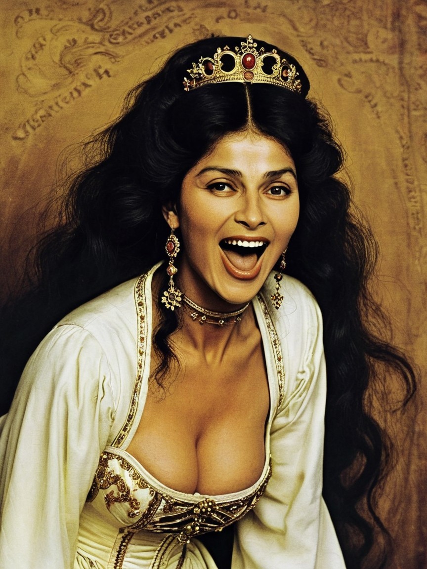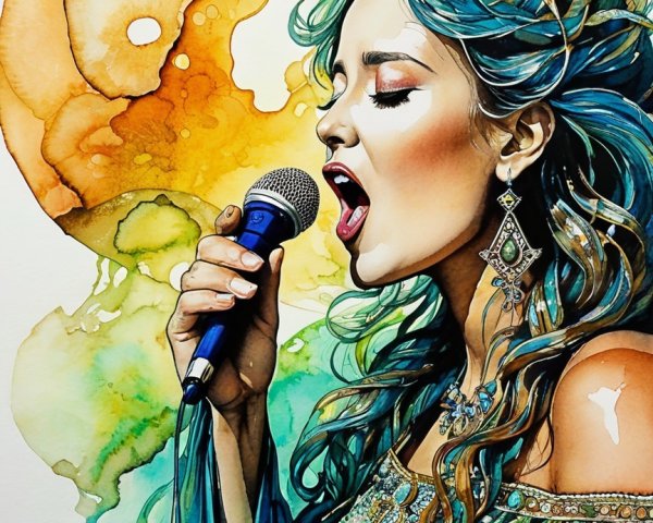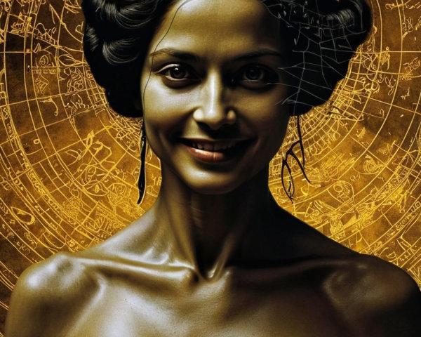 A close-up portrait of a woman with striking features, adorned with colorful floral elements and delicate freckles, she's wearing an elegant earring. Her lips are calm when she is listening to far wish: