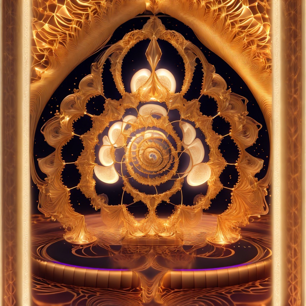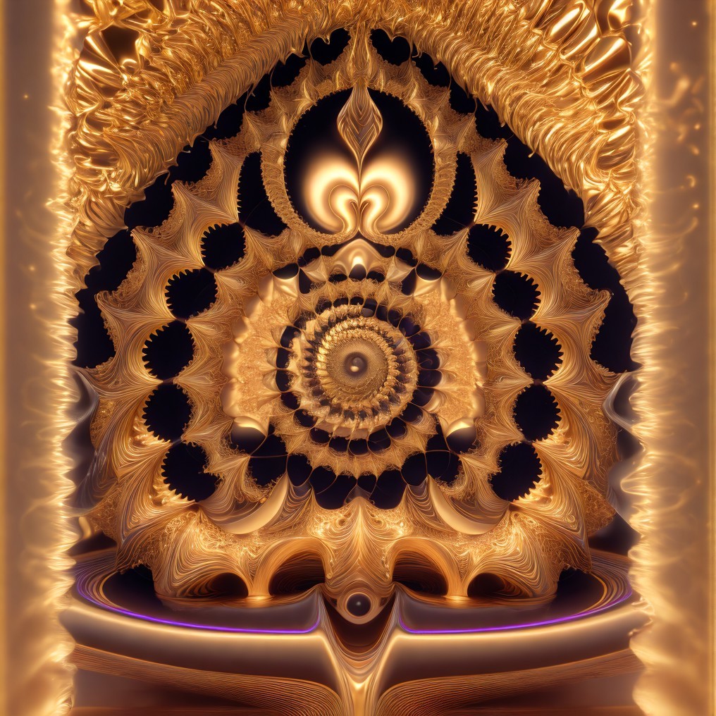 Symmetrical fractal image: Intricate golden patterns, peacock tail vibes