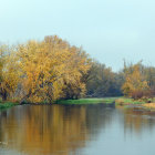 A serene river flows gently through a landscape adorned with vibrant autumn trees, their golden leaves reflecting in the calm water, creating a picturesque and tranquil scene.