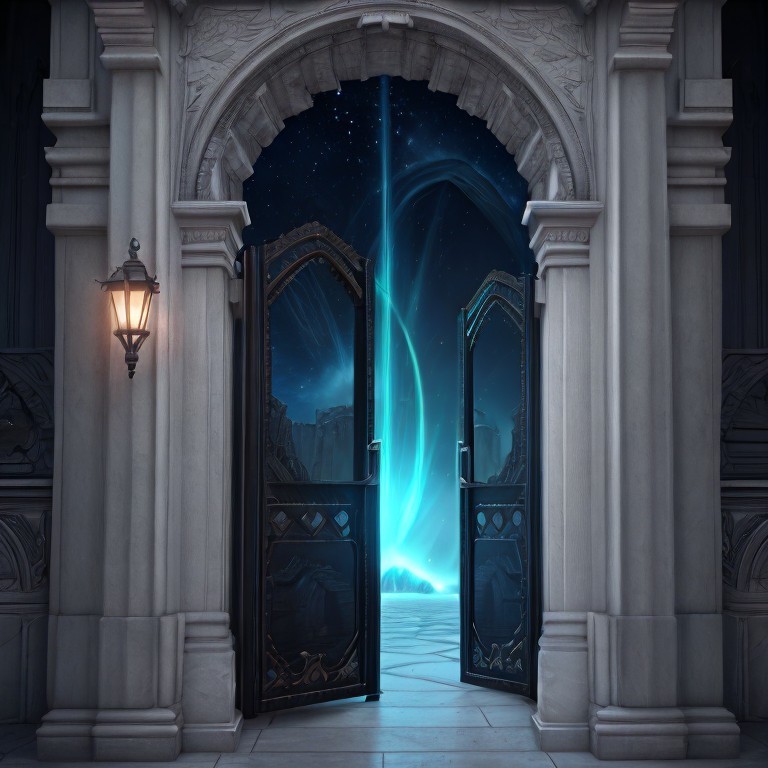 Ornate gate opening to mystical night sky with crescent moon and glowing lantern