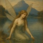 A serene fairy with shimmering wings sits in a tranquil lake, adorned in a glittering green gown. Nearby, a small figure in a boat adds to the enchanting, mystical atmosphere of the scene.