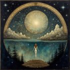 A serene scene depicts a woman in a flowing dress standing by a calm lake, gazing at a luminous full moon framed by a starry sky and soft clouds, surrounded by autumnal trees and flowers.