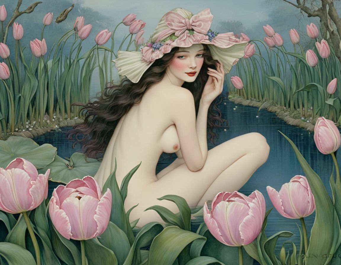 A woman in a pink dress and floral hat sits amidst tulips by the water, exuding an ethereal, vintage charm.