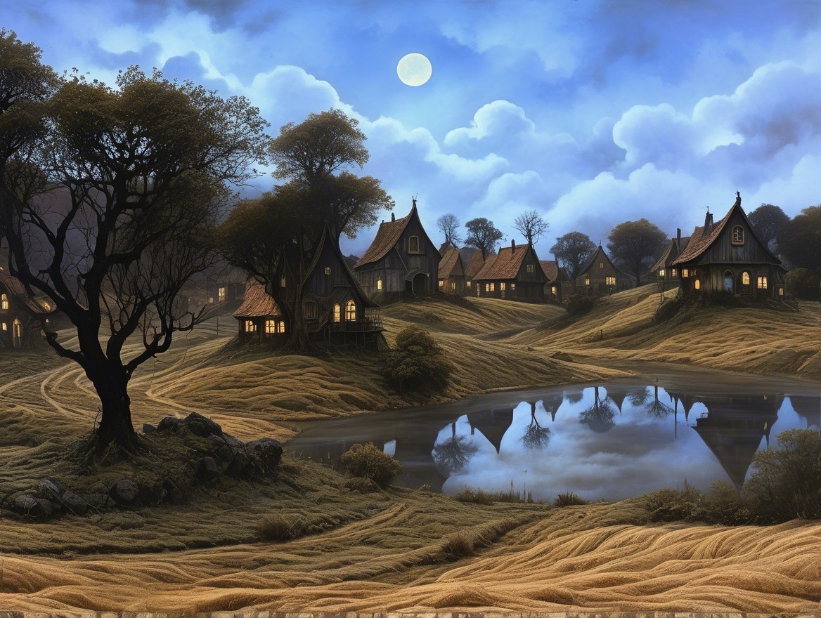 A serene night scene depicts quaint houses by a calm lake, illuminated windows reflecting the moonlight. Soft hills and trees frame the peaceful landscape under a starlit sky.