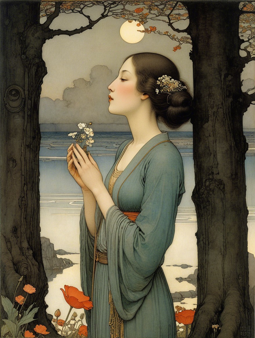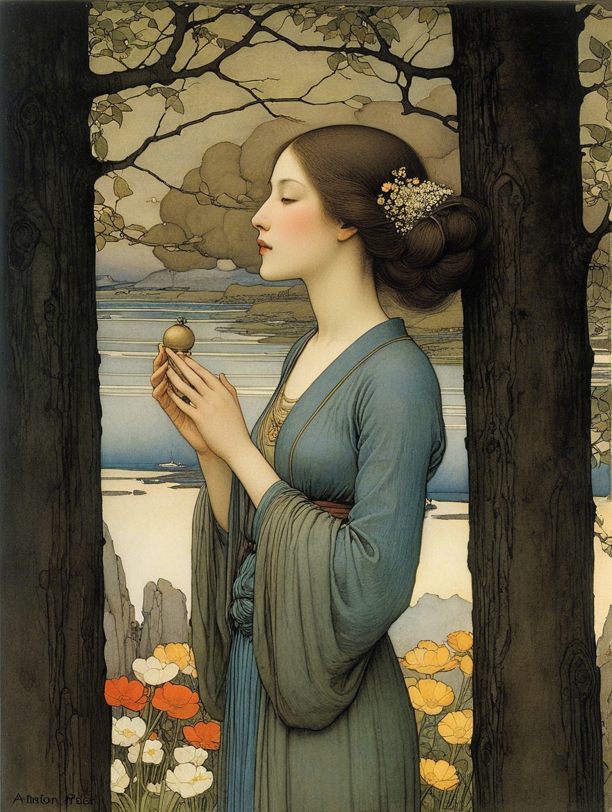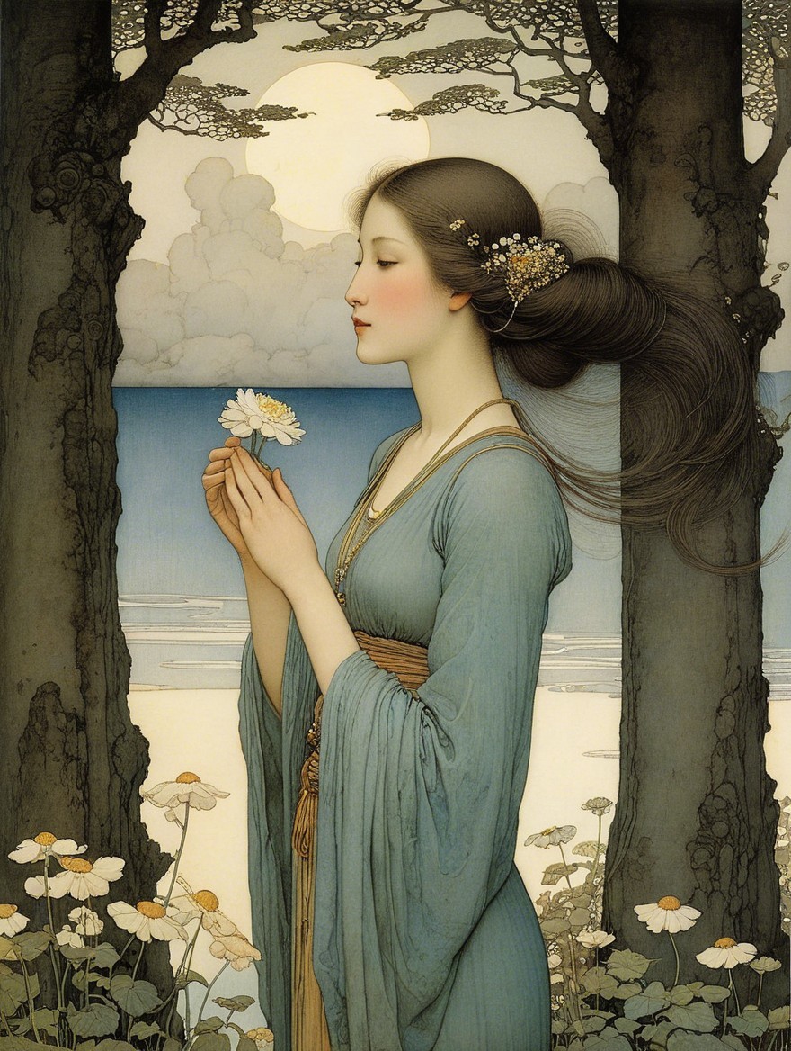 A graceful figure stands amid ancient ruins, adorned in flowing garments and jewelry. Her elongated silhouette contrasts with a luminous backdrop, evoking a sense of power and elegance.