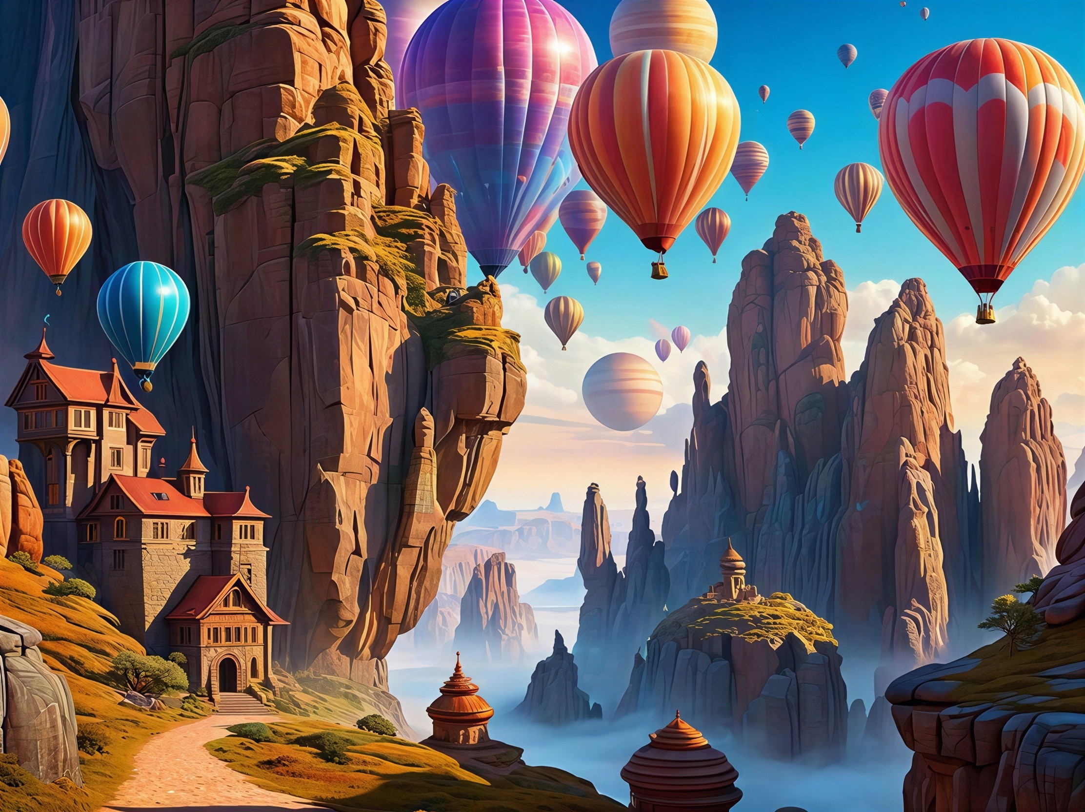 A highly detailed digital painting depicts a fantasy landscape featuring hot air balloons, mountains, and castles with a 4K resolution. The sky is bright blue in the upper half of the image, gradually transitioning to a lighter, hazy blue as it descends towards the horizon. White and gray clouds are visible in