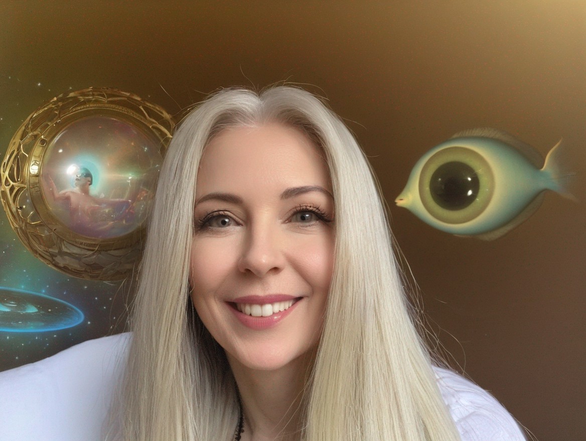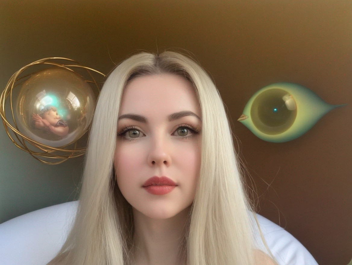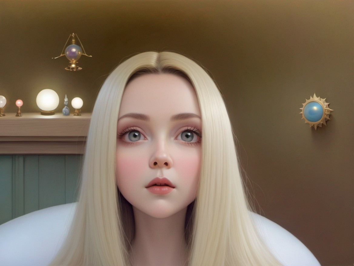 Stylized animated female character with large eyes and blonde hair on futuristic background