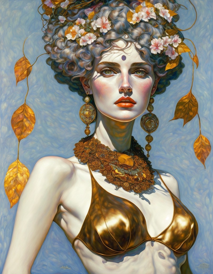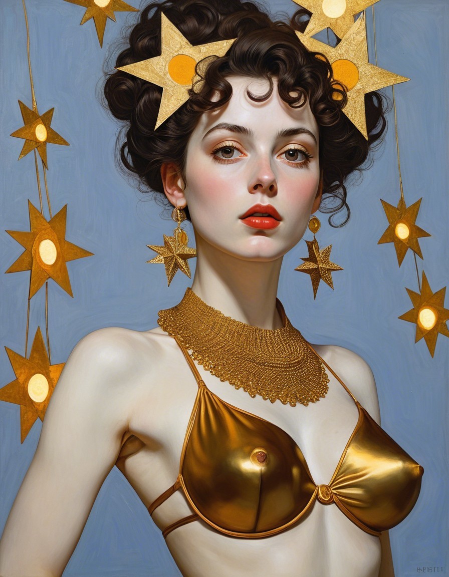 A captivating steampunk-inspired woman with intricate gear accessories and a celestial backdrop. Her elegant attire features metallic elements, blending fantasy with a sense of cosmic mystery.