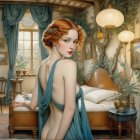 A young woman with vivid red hair sits pensively on a bed in a cozy, elegantly furnished room, adorned with lush plants and warm lighting, creating a serene and inviting atmosphere.