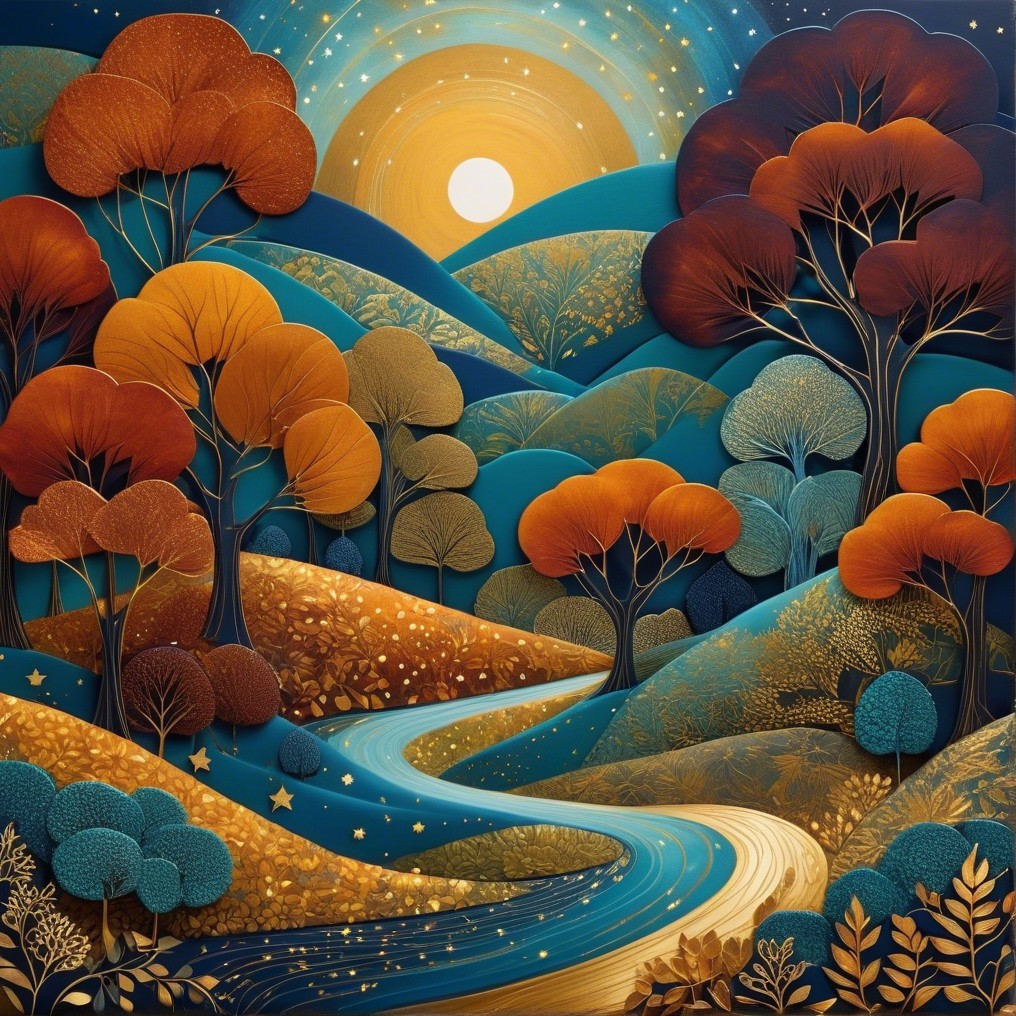 A vibrant, layered landscape features rolling hills bathed in golden sunlight, surrounded by stylized trees in rich blues and warm oranges, with a winding river reflecting the serene atmosphere.