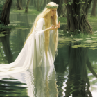 A serene scene unfolds as a young woman in a flowing white dress gently touches the water's surface, surrounded by lily pads and vibrant fish, under the soft glow of a tranquil forest setting.