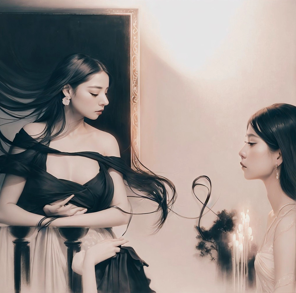 Emotionally charged performance, solo female singer, a cappella, expressive sorrow, night setting, Zen-inspired aesthetics, intertwined emotions, mindful elegance, ink medium, dark canvas backdrop, truth in brushstrokes, delicate porcelain motifs, shadows of melancholy, iridescent narrative, detailed emotional storytelling, surrealistic elements, ethereal color scheme, soft and dramatic lighting.