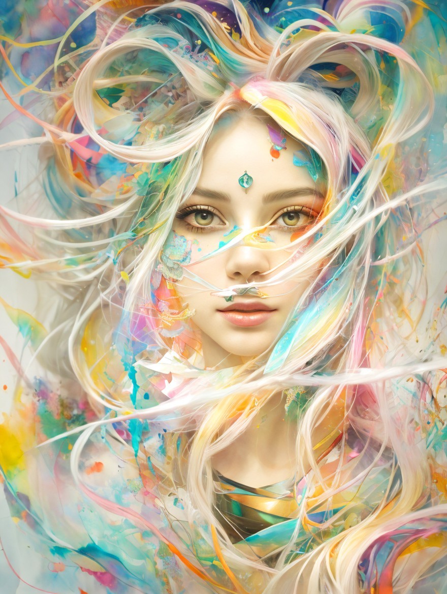 Fragmented female spirit portrait, surreal and abstract collage, free-flowing movement, mixed media artwork, multimedia painting, whimsical and beautiful, vibrant and unusual color palette, lightning effects, intricate fragmented designs, incorporation of masks, watercolor elements, vivid warm colors, created by AI artists Midjourney, Deep Dream, and Wonder. The artwork features a colorful and hyper-realistic style with maximalism, detailed and unique design, executed in an unreal engine. The resolution is set to 4K or 8K with HDR enhancement, showcasing surreal studio lighting for a visually stunning effect.