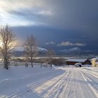 A serene winter landscape with quaint wooden houses blanketed in snow. Dark clouds loom overhead, while soft light spills from the horizon, creating a tranquil yet dramatic atmosphere.