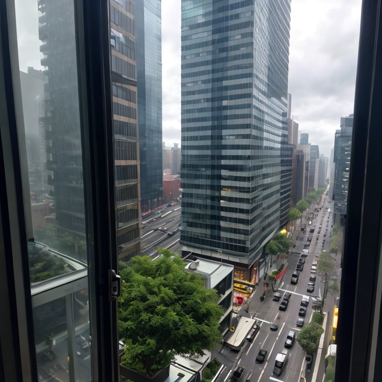 City view from a high-rise showing a street lined with modern buildings, greenery, and overcast skies.
