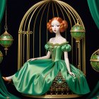 A serene, stylized figure rests within a golden cage, adorned with intricate patterns. Soft turquoise hues and elegant lanterns create a mystical atmosphere, blending beauty and tranquility.