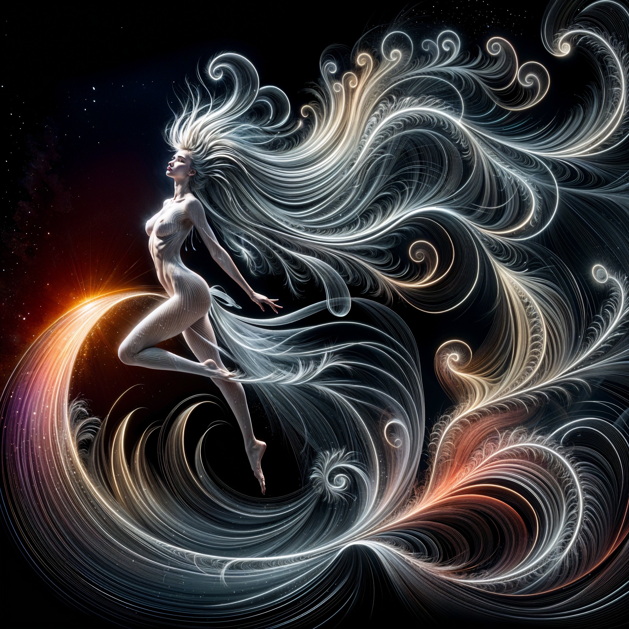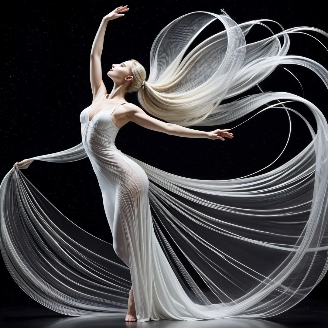 A graceful figure dances elegantly in a flowing, sheer white dress, with long, flowing hair creating a sense of movement. The contrast against a dark background enhances the ethereal vibe.