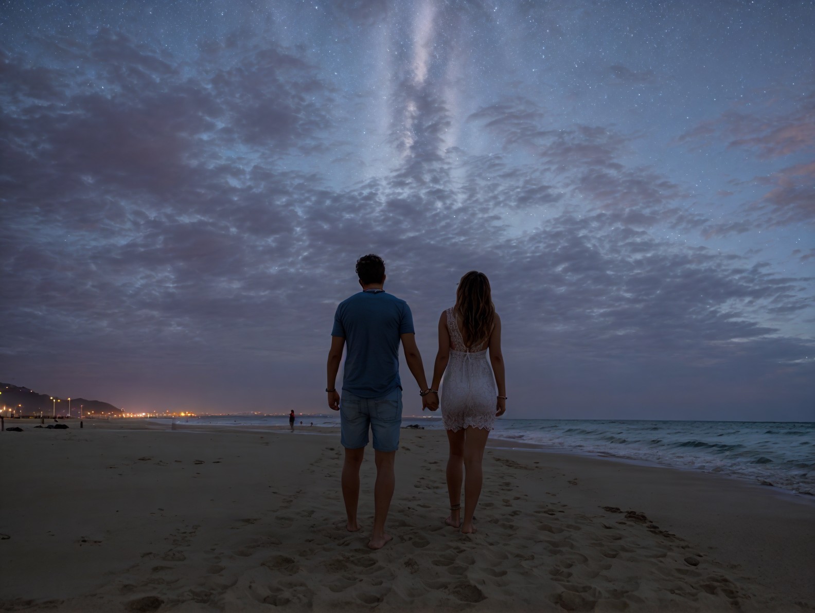 Romantic couple holding hands on beach at night with starry sky