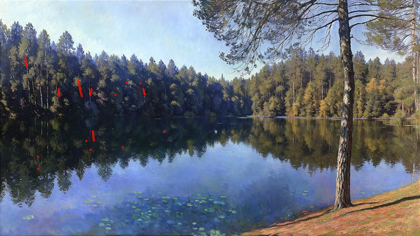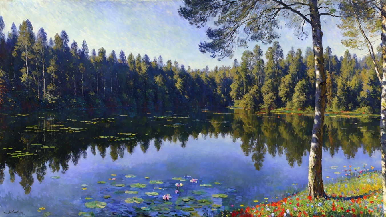 A serene painting of a forested lakeside with lily pads, a birch tree in the foreground, and vibrant flowers.