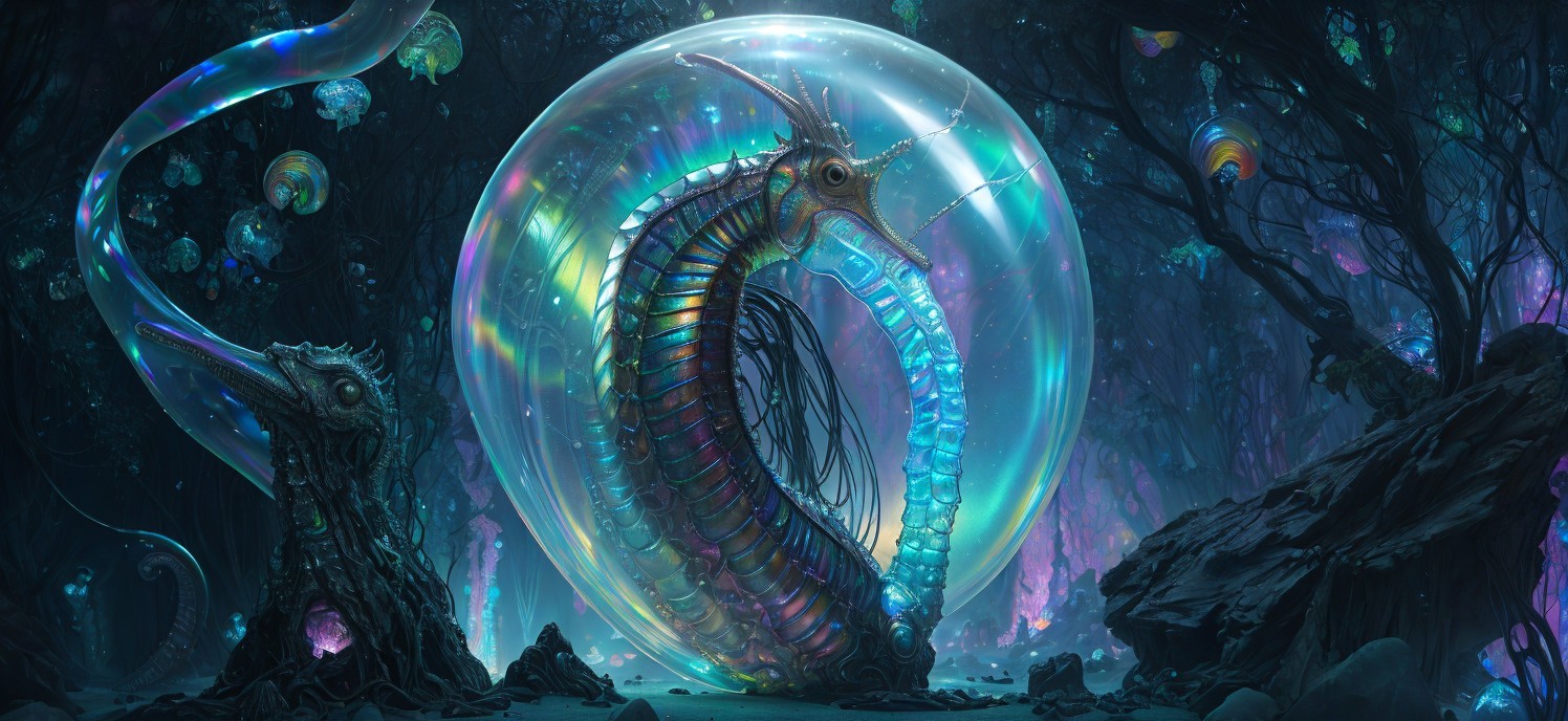 Prompt: worm with a seahorse head, translucent, Transparent, glassine, high reflectance: backlit chromatic prismatic iridescent rainbow glass alien, elegant fantasy sculpture, by Daniel f gerhartz, Gustave dore, hr giger, tom bagshaw,junji ito, biomorphic astronaut extraterrestrial, style of h.r. giger, insanely detailed and intricate, golden ratio, hypermaximalist