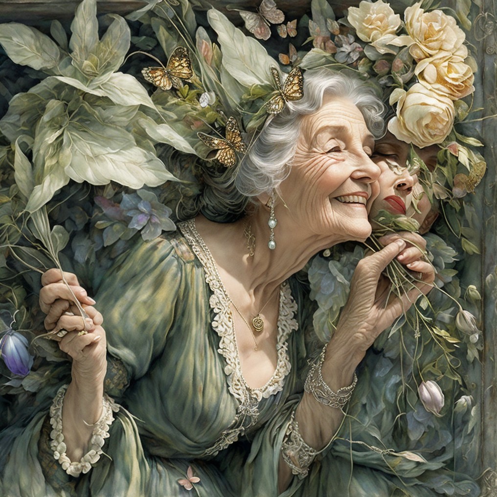 An elderly woman with long, flowing gray hair, wearing a vintage green dress, smiles joyfully surrounded by butterflies and flowers in a whimsical, enchanting garden.