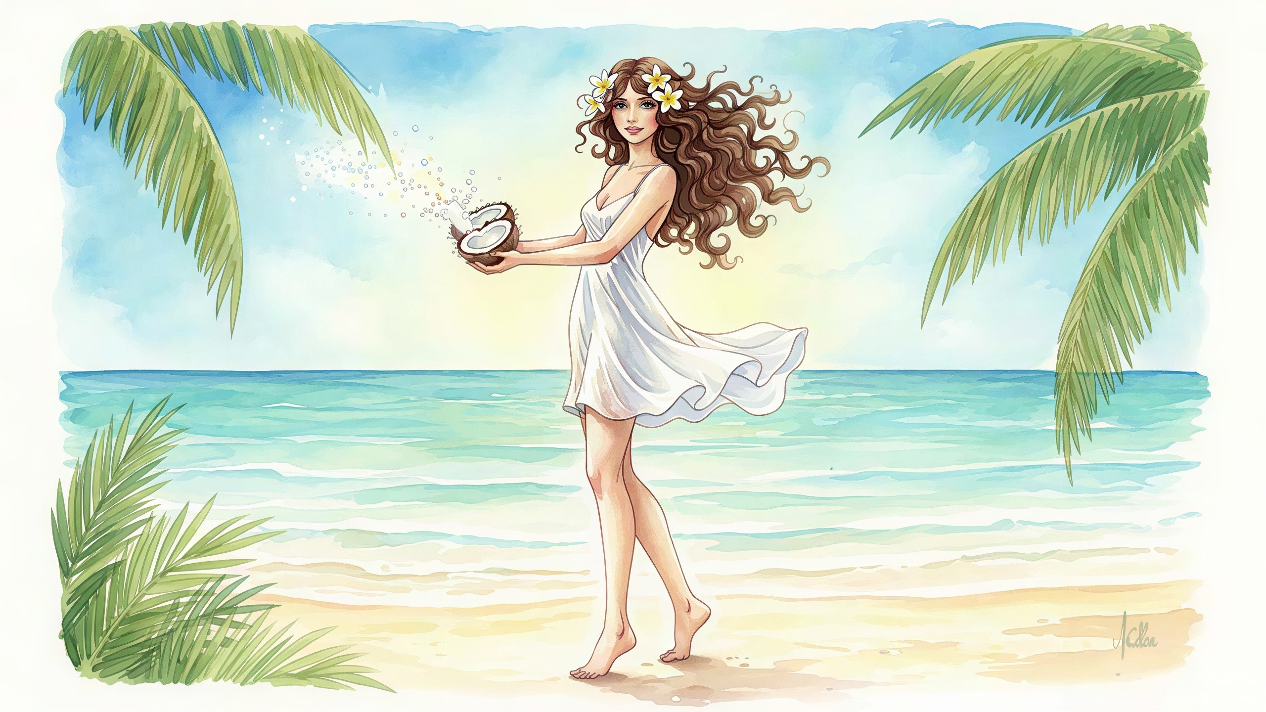A watercolor painting depicts a beautiful fair-skinned woman with long, flowing brown hair, wearing a white flowing sundress, standing on a beach. She is barefoot and facing the viewer, holding half of a coconut that is pouring out coconut water. Her hair is adorned with delicate cream-colored flowers.